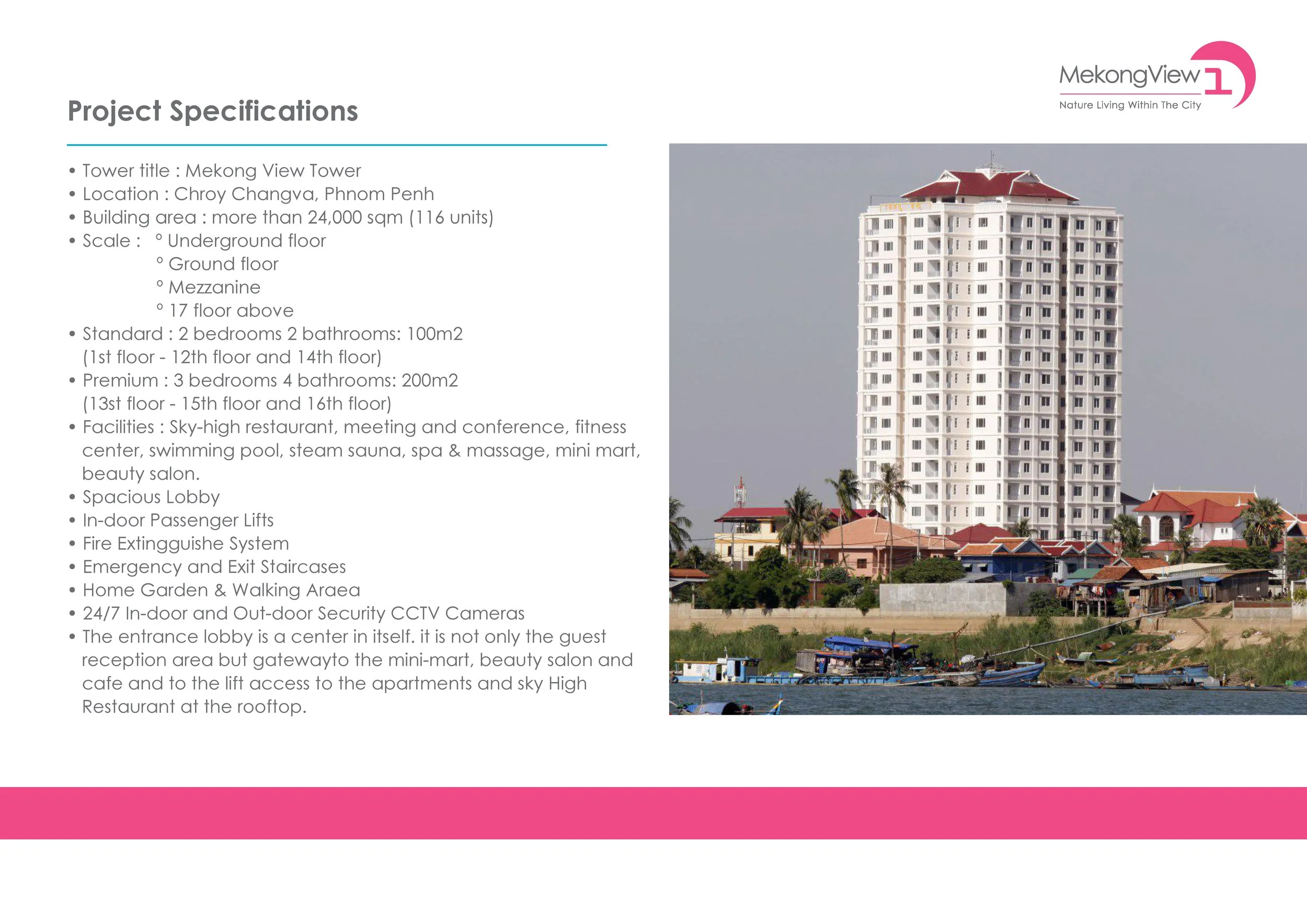 Key Features and Amenities: Mekong View Tower 1 is often described as a "CondoTel," a hybrid building offering both condominium units for long-term residents and hotel-style accommodations for short-term stays. The tower provides a range of amenities designed for comfort and convenience: Accommodation: The units range in size and style, with options for 1-bedroom, 2-bedroom, and 3-bedroom units. They are typically fully furnished, with features like private balconies that offer views of the city or the nearby Mekong and Tonle Sap rivers. Recreation and Wellness: Residents and guests have access to a variety of facilities, including a swimming pool (often a rooftop or outdoor pool), a well-equipped fitness center/gym, a sauna, and a spa. Dining: The building has a rooftop restaurant and sky lounge, providing a scenic spot for dining and socializing. Services: Other services include 24/7 security and CCTV surveillance, elevators, and a parking area for cars and motors. Some listings also mention a pet-friendly policy. Location: The project is situated in the Chroy Changvar district, an area that has seen significant development and is considered a growing residential and commercial hub. It is located on Keo Chenda Street, which is a key road in the area. The location is valued for its proximity to both the city center and a more serene, less-crowded environment. It's often highlighted that the building is just a short drive across the Japanese Bridge to central Phnom Penh, and is near local amenities such as supermarkets, restaurants, and schools. Developer: The developer of the Mekong View Tower series is MekongView Properties. They are noted as being a pioneer in the Chroy Changvar area, with several projects in the vicinity. The company has a reputation for offering "buy-to-rent" investment opportunities with features like guaranteed rental schemes and buy-back options for investors.