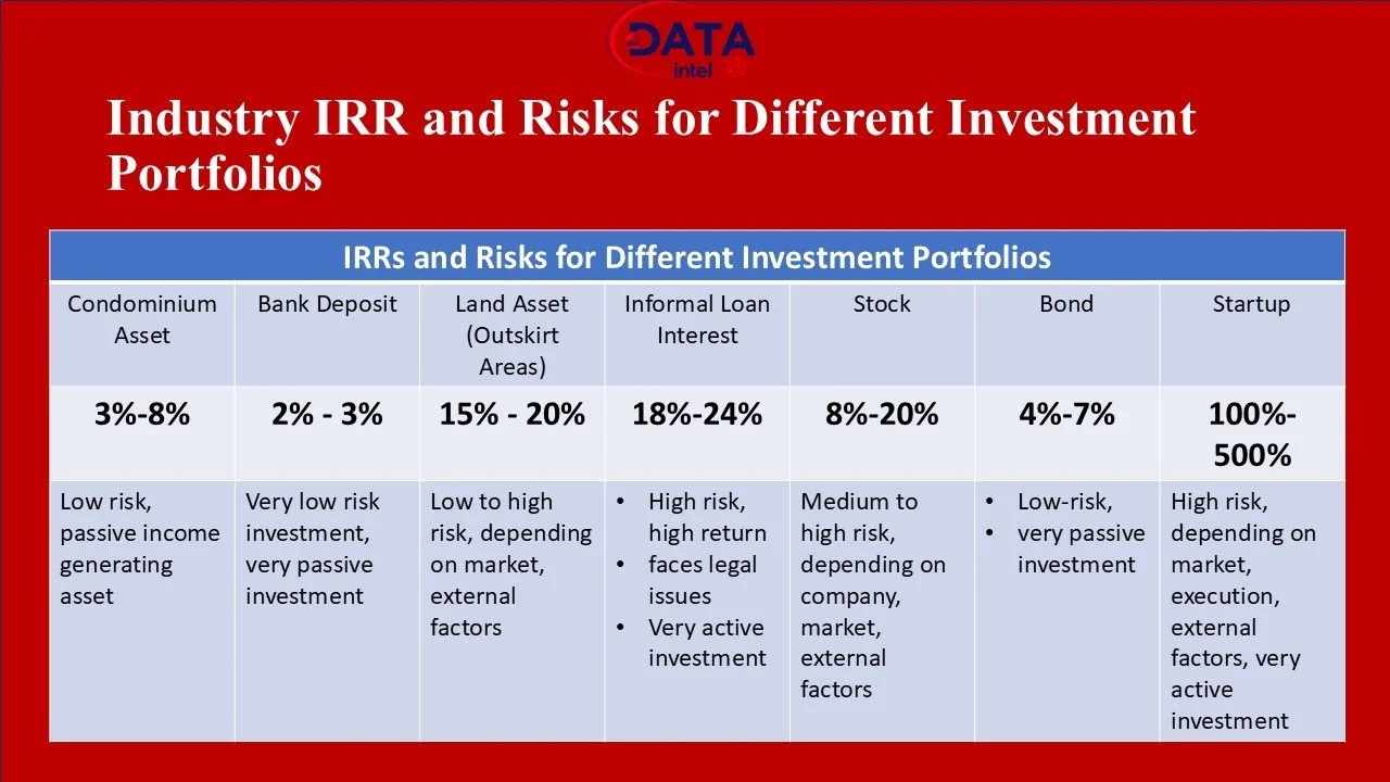 On average, let's put it into a fixed term of five-year investment. If you're going to invest into a condominium unit in Phnom Penh, the threshold of internal rate of return (IRR) is between 3% (lowest) to 8% (best), with the average of 5.5%. Some condo projects may return better thanks to their quality, location, management, and facility factors. And the most important point is that condominium poses less risk and is a mild passive investment.