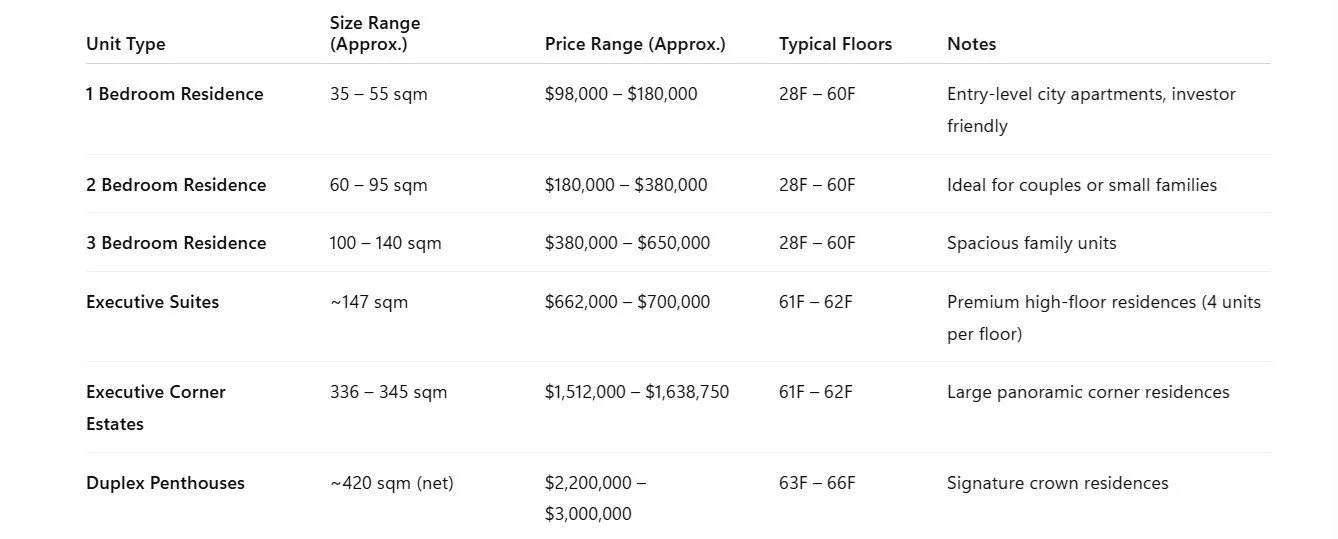 Private residences occupy Floors 28–60, offering a range of unit layouts suitable for investors, professionals, and families.