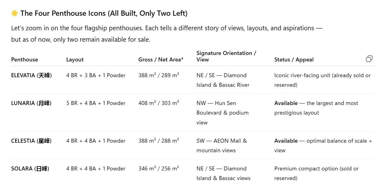 You see the narrative: while ELEVATIA and SOLARA helped shape the penthouse collection’s identity, they are no longer on the market. That makes Lunaria and Celestia your only direct gateway to penthouse living in Phase 2.