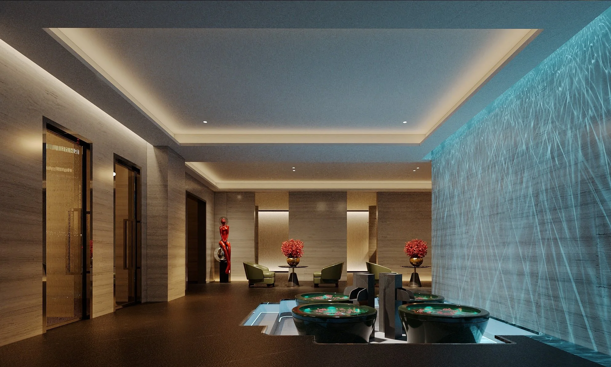 Sauna and steam rooms provide spaces for relaxation and recovery, while the jacuzzi areas offer elevated moments of calm above the city. Complementing these is a dedicated health center designed to support both physical and mental rejuvenation.